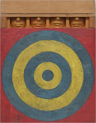 return to homepage The Holeness Ken Johnson reviews another exhibit in a recent New York Times edition (Jan. 8, 2009), this time the Jasper Johns exhibit at MOMA. Johnson begins this way: The exhibition affords an occasion to ponder its possible deeper currents of meaning. Consider, for starters, “Target with Four Faces” (above). There is the slyly punning relationship between the eyeless faces and the single bull’s eye, which might be construed as representing the limits of individual perception versus the completeness of transcendental vision. Also there is tension between fragmentation and wholeness, which, embodied as it is in the style of an old carnival game, generates feelings of nostalgic melancholy. There is that “tension” again that Johnson likes so well to manufacture from nothing, as he did with Pearlstein. Here it is a tension between fragmentation and wholeness. But once again, I have to ask, “Is there a possible tension between fragmentation and wholeness?” No, there is no tension, they are simply opposites of one another. You either have fragmentation or you have wholeness. You cannot have both, so they cannot create a tension. If one is there, the other is not. Tension must be between two present qualities: you cannot have tension between two words, especially when one of them is not applicable. Do you see any wholeness in that painting? I don’t. I guess Johnson thinks that because we have a circle, we have wholeness. But a circle is a circle and wholeness is wholeness. A circle may represent wholeness, it is true, but it may also represent “holeness” or “donutness” or “targetness.” Given that we are talking about Jasper Johns here and given the circles within circles, I think it is probable we have targetness here, not wholeness. Is there a tension between targetness and fragmentation? I almost hate to ask, because I am quite certain Johnson could come up with a yes answer somehow. But, if we look at the actual painting, we come up with nothing. There is no tension there, just a flabby idea and a fake mini-mystery that is not worth unraveling. The greater mystery is why anyone bothered painting this, why anyone bothered taking it seriously, and why art history decided to make its creator, Johns, rich and famous. That question certainly creates some tension, at least in me, but I don’t think it is the tension Johnson is talking about. Johnson also claims there is "a slyly punning relationship between the faces and the bulls-eye". [Aha, so it IS a bulls-eye, not a wholeness!] As with the tension, Johnson can’t really tell us where the pun is. A pun is normally a humorous ambiguity, but we can’t expect modern critics to know what words actually mean. They don’t use words as denotative or connotative letter compounds anymore, they use them—according to the NYT art criticism handbook—as “colorful suggestions, intimations ripe with relative meaning.” So punning doesn’t really mean “punning” here, it just happens to be the right length and have the right sound on the lips. Besides, the painting doesn’t need to contain any humorous ambiguity: the word “punning” already contains it. The word “punning” gives you a little smile, even applied to nothing, and you can apply that smile to the void of the painting if you like. The problem is applying this punny smile while you are also drifting into "nostalgic melancholy." Lot of tensions here, aren't there? Miraculous, really, how Johns manages to hit every possible human emotion in such a small patch of motionless square-footage. We laughed, we cried, we went to heaven and hell, it was an emotional roller coaster, a technicolor panorama, a feast of extravaganzas, a veritable smorgasbord of dichotomies.