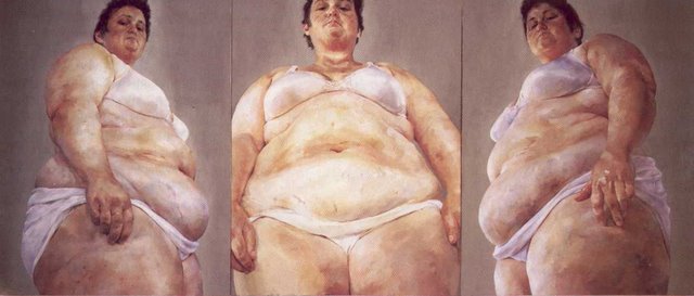 But is there really any depth there, political or otherwise? I don't think so. The political depth of Saville's art goes precisely as deep as would the art of a bald man "speaking for all bald men and the terrors they have endured." Go back to her "extreme humanness" quote. Are ugly, scarred, fat people really more human than other people? Let's flip that over and see how it looks. What if I said, "I paint beautiful people because they are more human. Their beauty means to me that they have probably done more interesting things, and are basically superior." You would think I was bonkers. But Saville's quote, although just as bonkers, is politically correct. It is allowable.