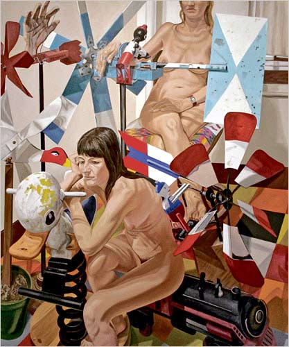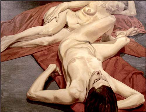 return to homepage Philip Pearlstein This month [January, 2009] Philip Pearlstein’s small retrospective in Montclair, NJ, is reviewed by Ken Johnson of the New York Times. Johnson begins the review like this: Around 1961, when he was in his late 30s, Mr. Pearlstein began to paint pictures of nude people from life. It was an old-fashioned idea, but in his hands, it became shockingly modern. He stripped the nude of almost all its customary associations. Beauty, eroticism, mythology, allegory: all the traditional justifications for nudity in painting were gone, leaving only the bare fact of the naked human body. As usual, I seek sense in that paragraph, and also as usual I fail to find it. Johnson’s article is not a critique, so none of this is meant as condemnation of Pearlstein. It is meant to be self-explanatory: anyone reading this will know who Pearlstein is, why else would they read it? If they are reading it, they probably like Pearlstein, so there is no reason to say anything substantive. All the readers need is a bit of tweeking from their daily slumbers, a bit of reminding they are still alive and can still read (or what now passes for it) in one modern language. So this introduction is a set of four sub-declarative sentences, posing as a meaningful pastime. Painting nudes is neither old-fashioned nor modern, although Johnson implies in a quiet, almost sneaking way, that it is. If we are to follow his noodly nudge, we must accept without thinking that the old-fashioned way to paint nudes was via beauty, eroticism, myth, and/or allegory. The modern way is to ignore them all. If a painter ignores them all, we are left with only a “bare fact.” If I were to try to insert some meaning into this sentence, I would say that a good artist gives us an image that is rich in some way. It may contain one or more of Johnson’s categories here or not, but it certainly will contain something. This applies to any good artist, of the past or present. An artist of the past who offers us an empty painting is a bad artist, and likewise for an artist of the present. Why would a viewer or reviewer be interested in a empty painting? Why should we care about the emptiness, as emptiness? Notice that Johnson does not tell us what Pearlstein’s paintings do contain, instead of beauty and so on. We are supposed to understand that Pearlstein’s paintings are modern—and therefore automatically interesting to modern viewers—not for what they contain, but for what they lack. Modern art is a bare fact. But is it? What, really, is a bare fact? What is a realistic subject stripped of all convention and category and intention? Is it a better painting? Is it a more interesting painting? With Pearlstein, we have a clear answer, though Johnson will not tell it to us. The answer is no, it is not a better painting. It is an empty painting, which is a worse painting. This would be the natural way to steer any review of Pearlstein, but Johnson must paddle the other direction. He must seem to be writing a review while almost silently continuing a long and subtle lie. We must get to the end of these faux-sentences without once realizing we are traveling head-downwards. More than that, we must get to the end of them firm in our old (but still avant) belief that nothing is something. We must believe the paradox: that stripping all meaning from something makes it more meaningful. “It is crushingly, grindingly empty, but it is modern, therefore its emptiness fills us!” Johnson continues, Realism returned from the dead in the 1960s, and Philip Pearlstein was one of its chief revivers. That sentence appears to give Pearlstein a positive action, but let us unwind it. To revive something, you must fill it with some kind of life, but Johnson just admitted that Pearlstein’s talent and credit was stripping away, down to the bare fact. So he did not revive the corpse, he re-embalmed it. And why was realism dead in the early 60’s? Johnson doesn’t want us to ask that question, he just wants the past to be dead and the present to be alive. But was it because normal people were sick of old-fashioned nudes, nudes with beauty and eroticism and so on? No. It was because theory and politics had killed all possibility of art for decades. Artists and professional viewers alike had become so anemic, so used to the bloodless wasteland, that they could not stand any signs of life or health. Realism did not return in the 60’s and it still has not returned. Only subject matter returned. Artists were allowed to paint things, but only stripped down bare-fact things. Things used as signposts for other things, things empty and torn and flapping in the cold modern breeze. But never things for their own sake. Never even bare facts, since facts have content. No, the modern painter is a painter of factoids. The shells and husks of facts, the outlines of ghosts of things that were once facts. This is Pearlstein’s place in the 20th century: he was the precursor of John Currin, the soulless modern posing as the revivalist. The only way to make the nude any deader than it was in the 50’s was to bring it back, to lay it on the dissecting table and to force people to look at its awful decay. To shove the rotting flesh in the face of the gasping public, as with Lucian Freud, or to prove to the still hopeful and naïve that the body had already gone to bone, as with Currin, or to ruin the last tiny erection by showing the plastic future already here and permanent, as with the brittle mannequins of Pearlstein. And yet the body in Mr. Pearlstein’s pictures — usually young, healthy and female — could not be completely neutralized. Tension between clinical objectivity and psychosexual intrigue gives the pictures a weird undercurrent, as if the painter were wrestling with his desires and almost but not quite overcoming them. Healthy? Can mannequins be either healthy or unhealthy? Because we see plastic skin instead of Freud’s rotting 