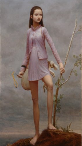 I wouldn’t honestly put Jacob and the Angel above Cody Swanson’s works here, even as an example of technique. But I look forward to future shows, in real halls, where Van and Cody can meet, and where we can compare their best works side by side. Add Faraute and Okorokov and a few others not mentioned here, and you have a real treat for any sculpture aficionado. To finish out my comments on the sculpture section, I am very surprised to see John Balsamo ranked ahead of Faraute, Joo-Hee Bae, and the rest. I don’t understand that one. But of the finalists left out of mention, Lauren Mills Bacchus is my favorite. I think that choice will shock most people, but I find a lot of character in that head. Also a lot of fine technique. To avoid two Swanson’s in the top three, I would probably place her third, after Zachariah and Old Man. That puts three old men’s heads in the top three, placed there by a painter of young women, but that is how it goes in this review. That means I have bumped Eichinger out. I don’t care for Eichinger, to be frank. He has all the worst qualities of MacDonald with none of the best. But he doesn’t need my approval: he is a market favorite and will do just fine without my admiration. The Bouguereau Award went to Christopher Pugliese this year, for his Persistent Dream of Youth. I have very mixed feelings about this painting. On the one hand, a painting like this requires a specific audience, and I happen to be a member of that audience. I am not offended at having to look at naked girls who may or may not be of age. As Jock Sturges has proven in court, laws of majority apply to strippers and the porn industry, not to art. We can paint anyone nude, as long as they agree to it. I am actually thrilled to see a beautiful young girl here painted with sensitivity and finesse, in a fairly straightforward manner, without playing too many modern or surrealist games. And she has pubic hair in full view! Who would have thought such a thing would make it past the censors, much less win a top prize? Yes, Pugliese has a real find here, as his central model, and he has captured her beauty well. That said, the rest of the painting is a distraction. He placed her between two flanking models who are not nearly as interesting, and then flipped them all and painted them again, with small variations. This gives him a sort of Jenny Saville effect, but with lovely young flesh instead of feminist-angst flesh. Not a bad idea, on paper. But once you see it, it begins to fall apart. The doubling waters down any strength in the nudity and any edge the painting might have otherwise had. The painting is not twice as good, it is half as good as it might have been. Pugliese is hiding behind a composition here. Just as Warhol used multiple images to make his car wrecks and such things less potent, Pugliese has used a mirror trick here to keep us from dwelling on the fact that his main girl is very young, very naked, and very beautiful. His composition allows us to begin making excuses for him and us immediately. “Oh, he is just using the bodies as part of a pattern. He is making a statement about youth, or persistence, or something. He is experimenting with forms.” Yes, but that is to divert the painting from its only real strength, which is the beauty and grace of that central figure. Why not let us look at it without making excuses, without surrounding it with games and distractions? This entry came out of the figurative category, I imagine, not the still life category. If so, the body should be used for its own sake, not as an objet. As a figurative artist, I am not interested in using the human body as a pattern or a compositional device, or as a hook for some phony title. I am interested in the human body pour soi, for itself. I think most honest viewers would agree. If they want games, they go to the avant garde. What we want here in realism is reality. Not reality as in photorealism or journalism or illustration, but as an earnest approach to the subject. Pugliese starts with that, but then decides that isn’t enough. It isn’t enough just to paint this lovely girl. No, he has to blend her into a composition and give it a Dali-esque title. It is too bad we artists have to title paintings at all. As pointless titles go, this one is not the worst I have seen, but it still topples in the direction of the pretentious. I think if Pugliese trims away the title and all but the top middle figure, he has a lovely and subtle work of art, with nice light, nice brushwork, and a gentle mood. As it is, he has an overblown and distracting work, one that only appears to answer the avant garde, but that really falls on many of its swords. But even if we accept the work as it is conceived here, there are still problems. If we number the heads from the top left, the first and fourth heads have something trollish about them. And it is not just the angle. In one the eye is in the wrong place and in the other the mouth is in the wrong place. We are also unsure why only the top middle girl is given a fullish coloration, while the others are left almost glazeless. It may be that Pugliese is trying to create a bit of focus on that figure, which is his best; or it may be something to do with the dream, so that only she is nearly awake. The rest are ghosts. It is not a major problem, since it can be explained away, but it is still a question mark, one that doesn’t necessarily make the work stronger. Then we have another question mark about the background. The blue is OK: good for dreams. But the square pattern is clunky. Almost anything would have worked better—subtle swirls or some sort of blend. Anything to keep the eye away from the background. We shouldn’t be noticing any brushwork in those areas, since they are only foils. Yes, Pugliese is quite talented and in some ways quite brave. But he has gone large and multiple here for no real reason, in my opinion. Personally, I would like to see him
