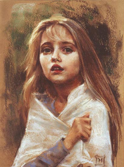 The second portrait was of an older girl. A fourteen year old with rich wavy brown hair. Her portrait was to be a full-length work painted in oils. The girl's name was Fiona. Her mother was from Flanders, and her name was Ghislaine. The father, named Seamus mac Ginnish, was a shopkeeper in Kilkenny. He was the richest man in Kilkenny, having made piles of gold in buying and selling. As all the poorer families went bankrupt and left for America or other places, he took over their land for a pittance, paying them only enough to clear out and buy boatfare. He also took all their farm equipment and their furniture and their livestock. Then, since there were few people to sell to in Ireland, he would ship it all over to England or France or Flanders where farmers could afford to buy it. He profitted from tragedy, as many rich men do.